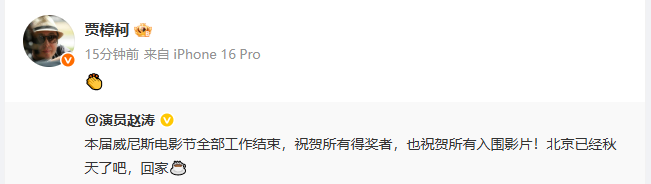 刚刚赵涛发文:本届威尼斯电影节全部工作结束,祝贺所有得奖者,也祝贺所有入围影片!北京已经秋天了吧,回家☕️