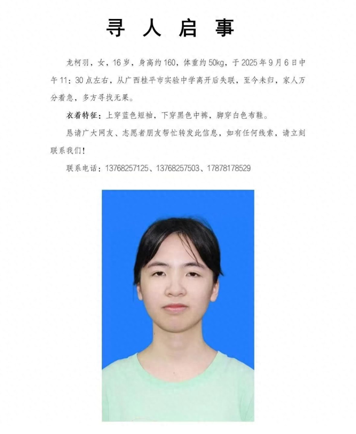 近日,广西桂平市实验中学16岁学生龙柯羽于9月6日中午11:30左右离校后失联,至今未归。据家属发布寻人启事,她离校时身穿蓝色短袖、黑色中裤和白色布鞋。