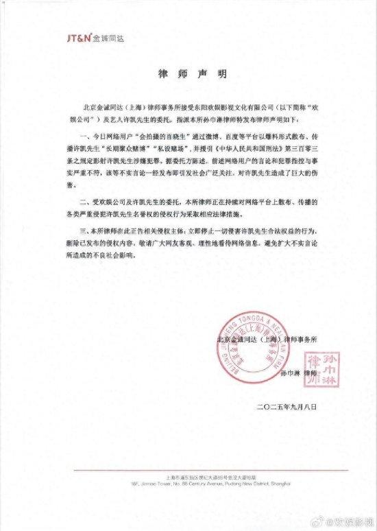 北京金诚同达(上海)律师事务所接受东阳欢娱影视文化有限公司(以下简称“欢娱公司”)及艺人许凯先生的委托,指派本所孙巾淋律师特发布律师声明如下: