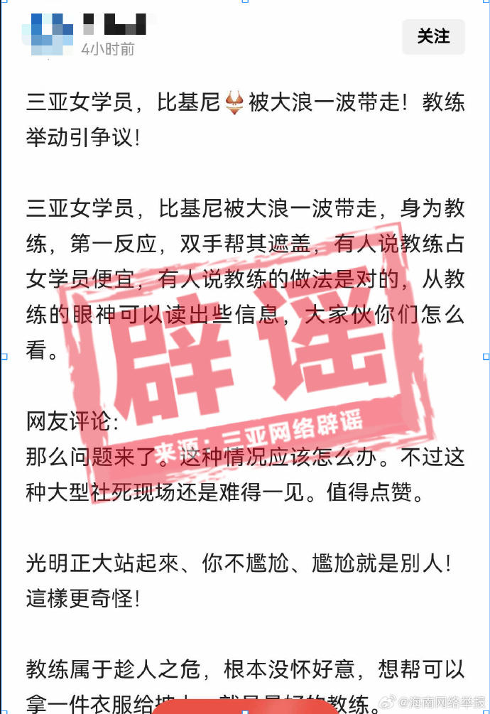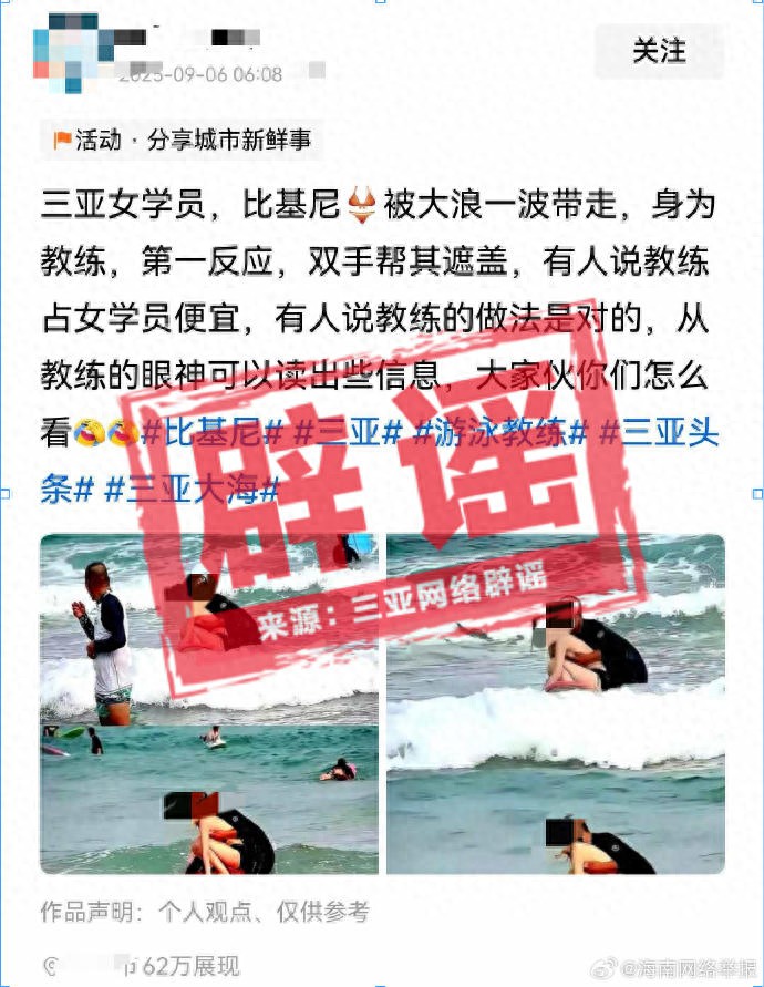近日,有网民在网络平台发布帖称“三亚一女学员比基尼被浪冲走,教练帮忙遮盖”,并配有多张图片及“#三亚#”等地域标签,引发关注。经核实,该事件并非发生在三亚,且三亚市文旅、公安及各大正规游泳培训机构等均未接到此类事件报告。
