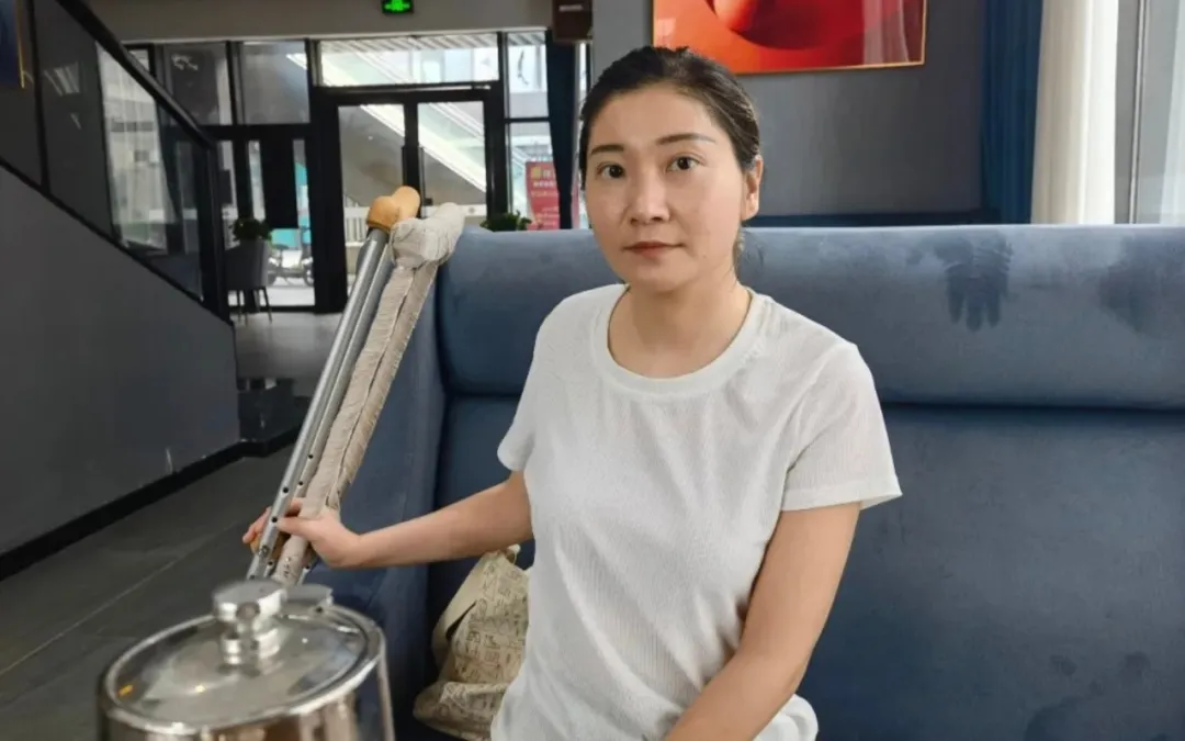 ▲2021年6月12日,王暖暖架着双拐来到家附近的一家咖啡馆接受采访。新京报记者 李照 摄