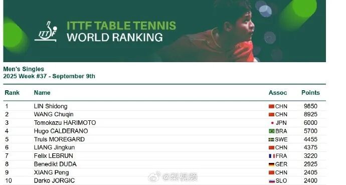 男单方面,林诗栋排名第一,王楚钦排名第二,张本智和排名第三,雨果-卡尔德拉诺排名第四,莫雷加德排名第五,梁靖崑排名第六,小勒布伦排名第七,杜达排名第八,向鹏第九,达科第十。