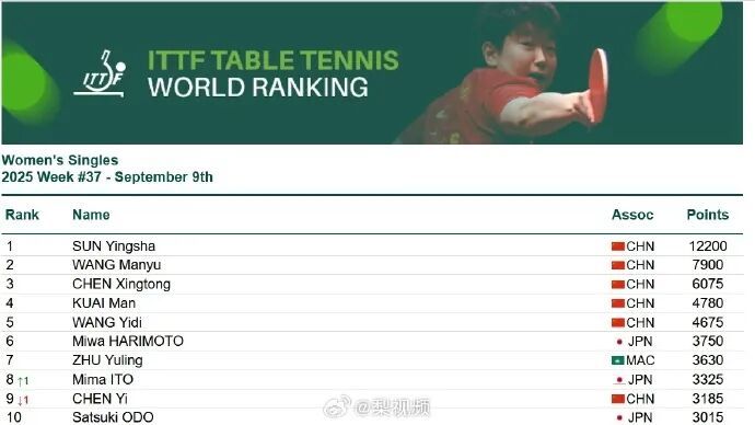 女单方面,孙颖莎连续165周世界第一,国乒包揽女单前五,分别为:孙颖莎、王曼昱、陈幸同、蒯曼、王艺迪。张本美和第六,朱雨玲第七,伊藤美诚第八,陈熠第九,大藤沙月第十。
