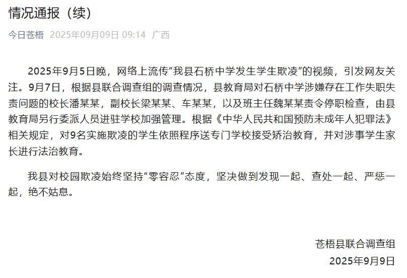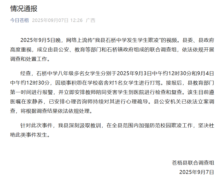 9月7日,广西苍梧县联合调查组就“广西一中学发生学生欺凌”事件发布情况通报: