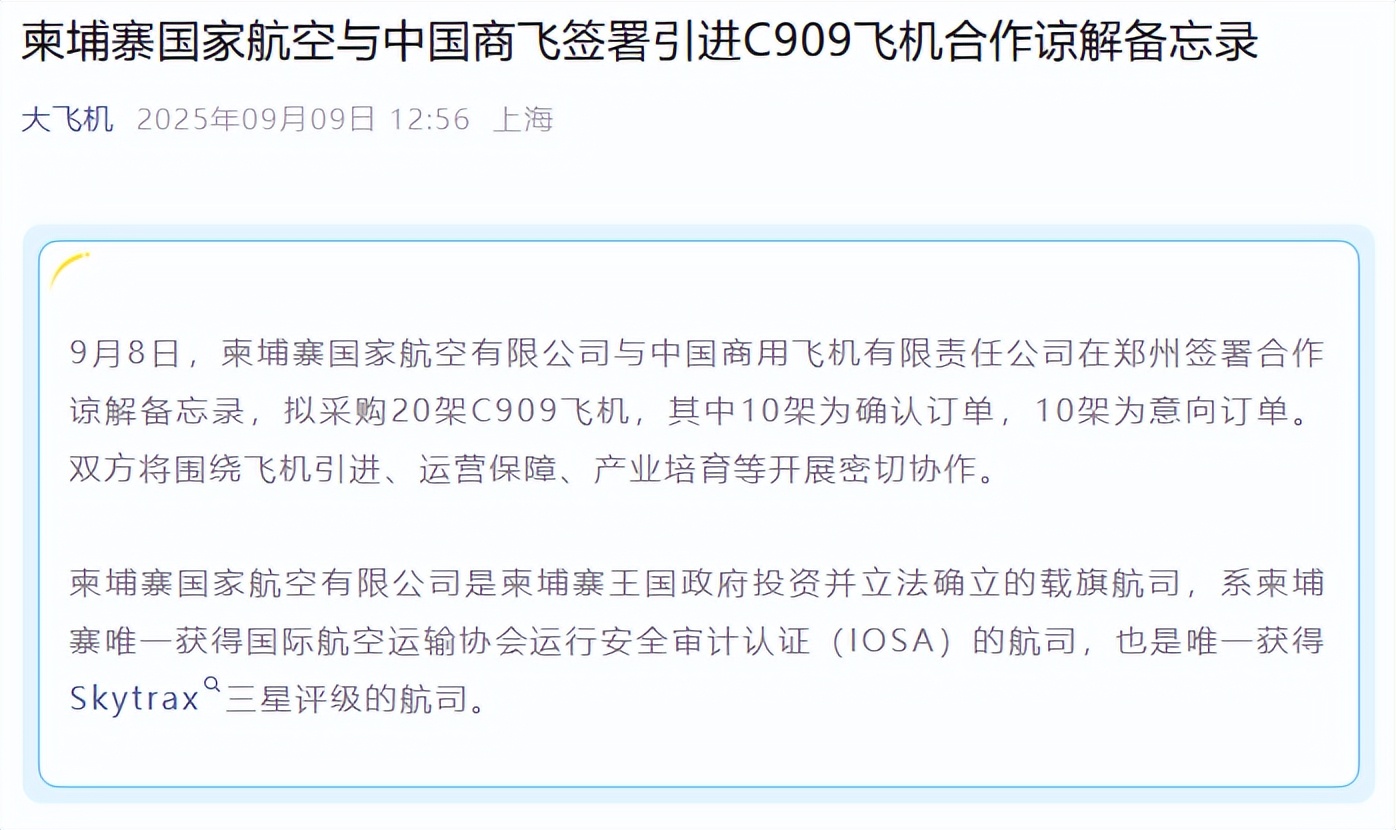 据中国商飞官方微信9日消息,9月8日,柬埔寨国家航空有限公司与中国商用飞机有限责任公司在郑州签署合作谅解备忘录,拟采购20架C909飞机,其中10架为确认订单,10架为意向订单。双方将围绕飞机引进、运营保障、产业培育等开展密切协作。