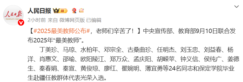 今天(9月10日),中宣部、教育部联合发布2025年“最美教师”。丁美珍、马琼、水柏年、邓宗全、古桑曲珍、任明杰、刘玉忠、刘益春、杨洋、肖惠文、邵瑜、欧阳陵江、郑万众、孟庆阳、胡嵘苹、钟义信、侯纯广、姜德生、秦春娟、秦宣、黄俊琼、廖红、翟婉明、薄宜勇等24名同志和保定学院毕业生赴疆任教群体代表光荣入选。
