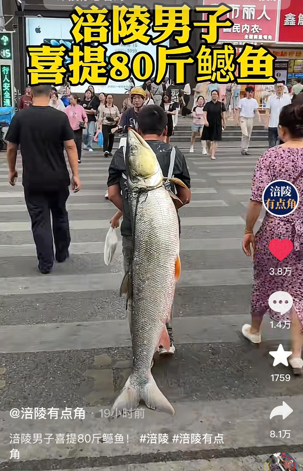 9月11日,视频发布者告诉极目新闻记者,视频中的主角姓罗,是他的朋友,9月10日下午钓到了这一条近80斤重的鱼,随后就到涪陵区市中心街上去“显摆”了,“毕竟这是钓鱼人的高光时刻。”