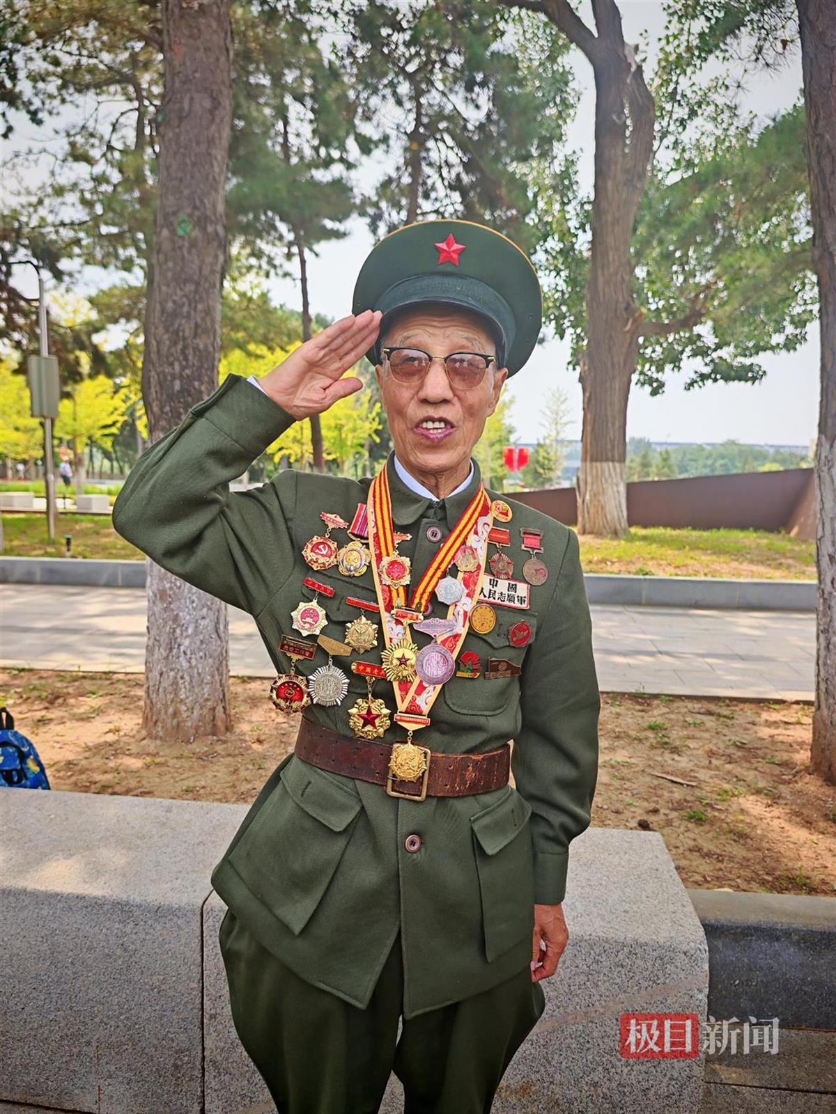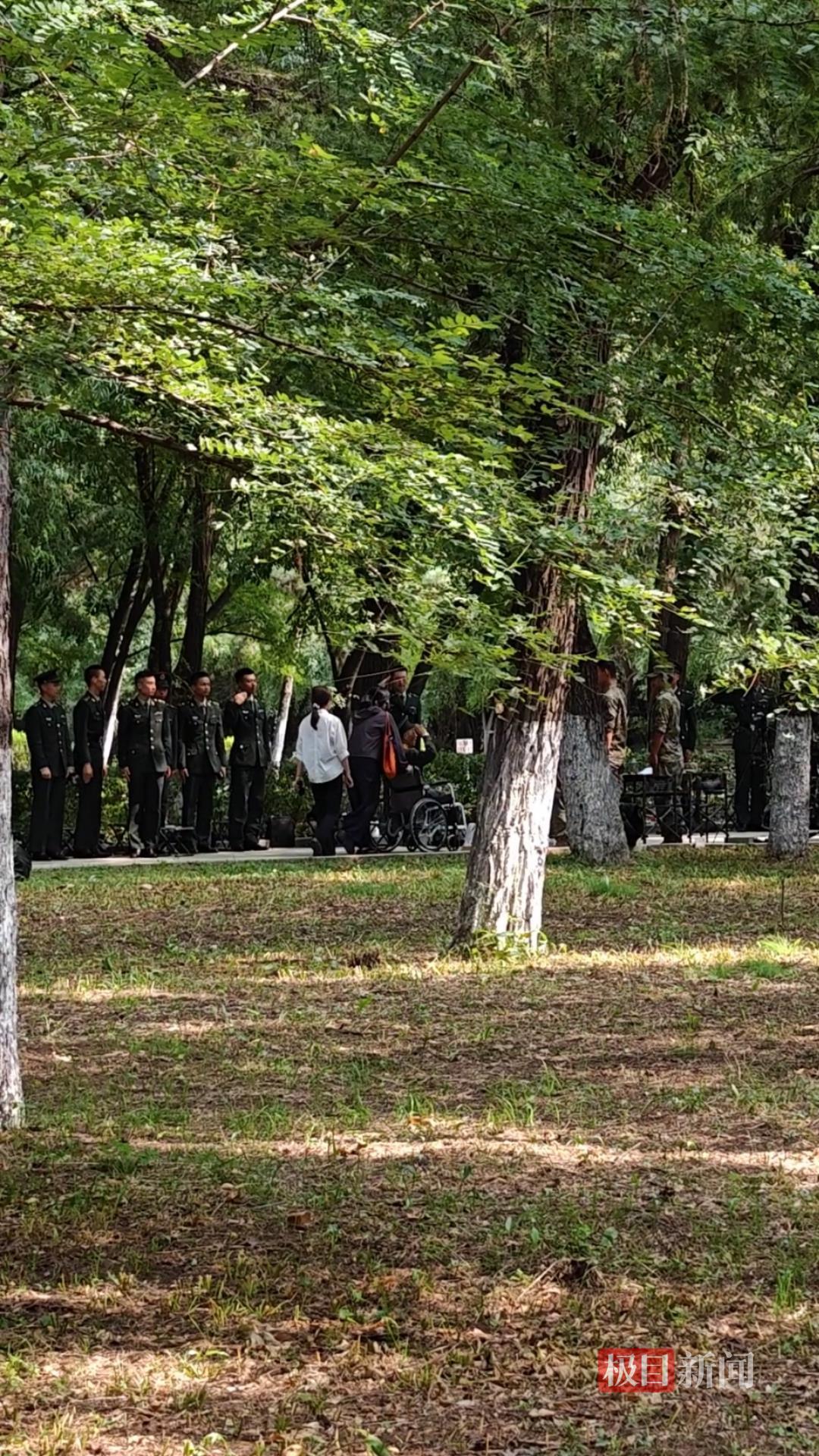 11日上午11时30分左右,极目新闻记者在抗美援朝烈士陵园内看到,一位身穿志愿军军装、胸前挂满勋章的志愿军老兵坐着轮椅穿行在烈士墓间,附近正在为仪式做准备的年轻战士们看到后,立即立正敬礼向其致意。