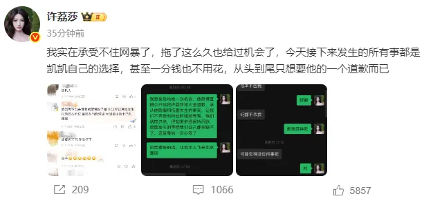 9月8日上午9:42,“休战”半个月的许荔莎在微博再次向许凯宣战。她表示,自己实在承受不了网暴,“拖了这么久(没继续发声)也给过(许凯道歉的)机会了,今天接下来发生的所有事都是凯凯自己的选择,甚至一分钱也不用花,从头到尾只想要他的一个道歉而已。”