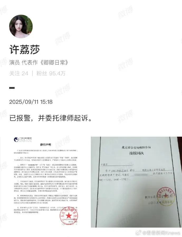 9月11日,演员许荔莎发文称:已报警,并委托律师起诉。