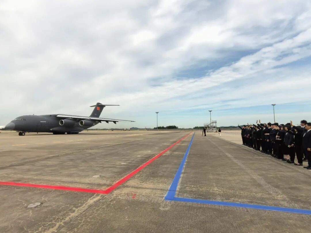 9月12日上午,执行接运第十二批在韩志愿军烈士遗骸回国任务的中国空军运-20飞机在韩国仁川国际机场起飞,搭载志愿军烈士遗骸的专机飞往沈阳桃仙国际机场。