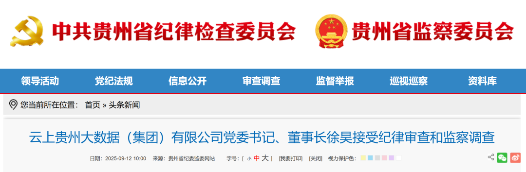 据贵州省纪委监委消息:云上贵州大数据(集团)有限公司党委书记、董事长徐昊涉嫌严重违纪违法,目前正接受贵州省纪委监委纪律审查和监察调查。