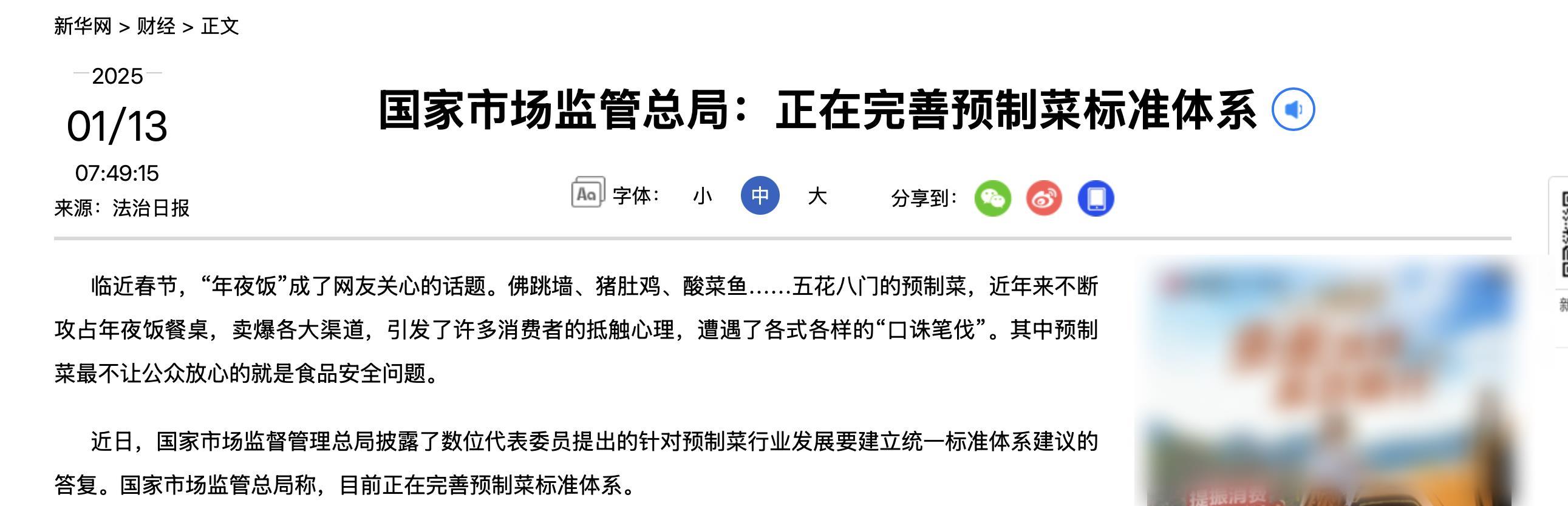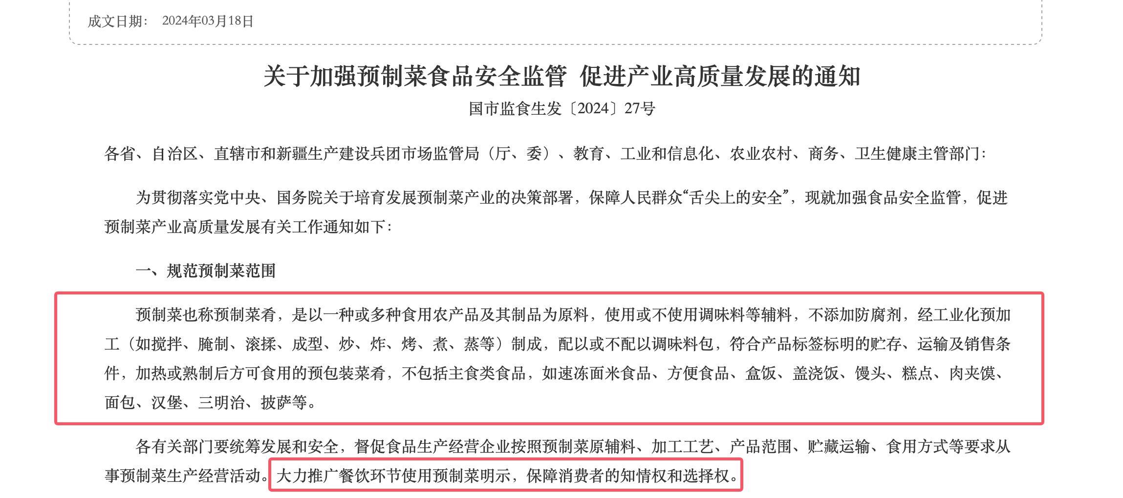 2024年3月,市场监管总局等六部门联合发布《关于加强预制菜食品安全监管 促进产业高质量发展的通知》。通知明确了预制菜定义和范围,规定预制菜中不添加防腐剂,推广餐饮环节使用预制菜明示。