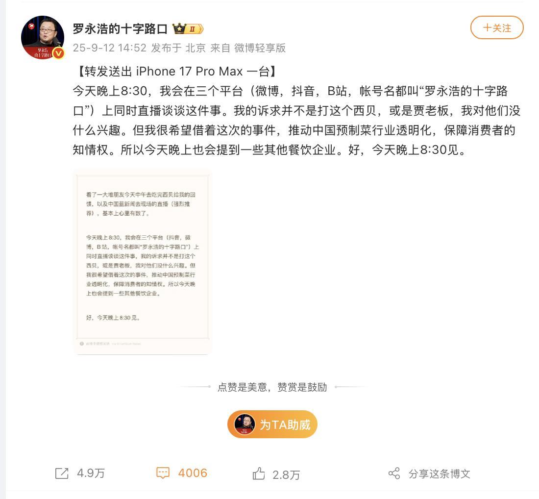 目前,这场关于“预制菜”的论战尚未结束。9月12日下午,罗永浩发博表示,当晚将直播谈论此事,希望借该事件,推动中国预制菜行业透明化,保障消费者知情权。