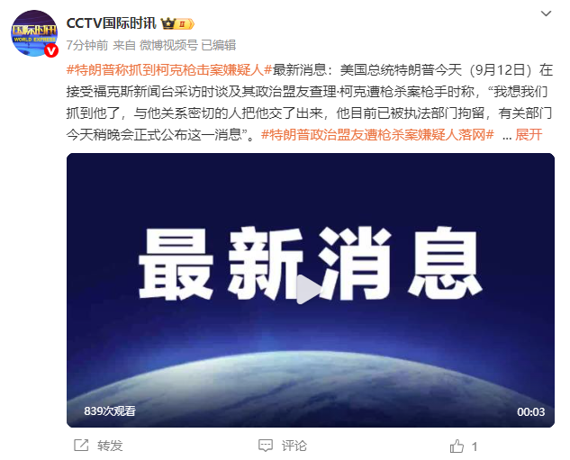 最新消息:美国总统特朗普今天(9月12日)在接受福克斯新闻台采访时谈及其政治盟友查理·柯克遭枪杀案枪手时称,“我想我们抓到他了,与他关系密切的人把他交了出来,他目前已被执法部门拘留,有关部门今天稍晚会正式公布这一消息”。