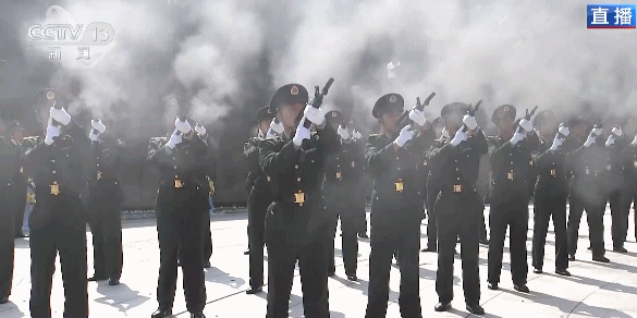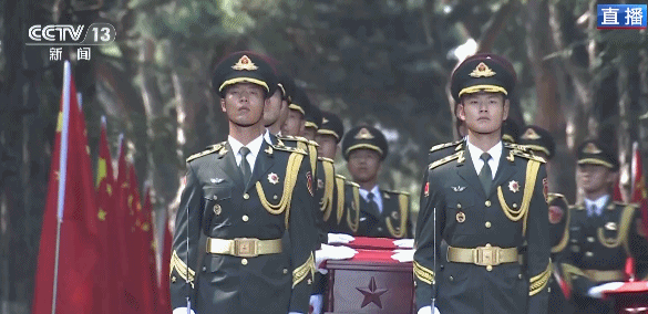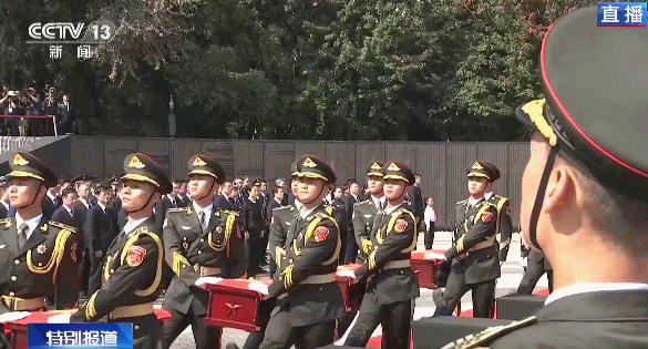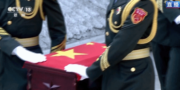 军乐队奏响婉转的《思念曲》,在解放军仪仗司礼大队战士的持枪护卫下,礼兵护送志愿军棺椁缓缓步入现场。