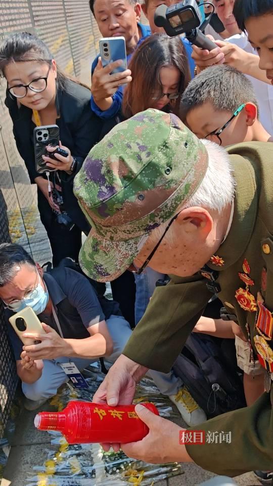 志愿军老兵曹家麟在李家发名字前洒上白酒