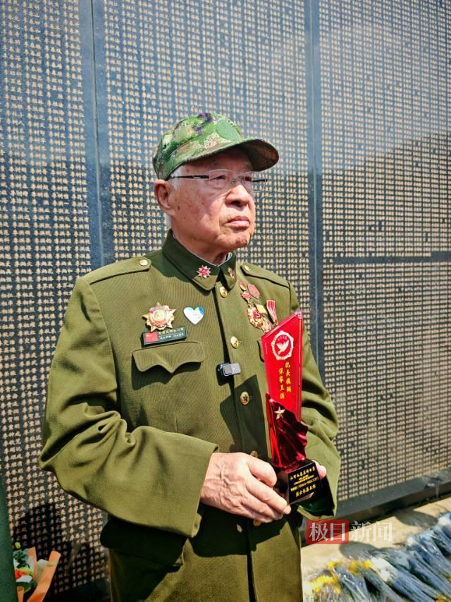 志愿军老兵在李家发名字前敬礼