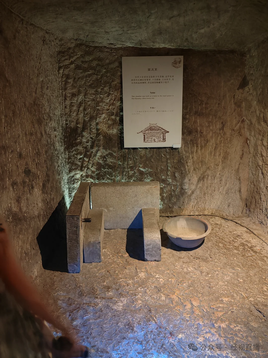照片显示,该标语位于该墓的盥洗区域。据介绍,汉代王宫中已设有完备的卫生设施,展区中复原的汉代石厕属于当时的高级厕所。