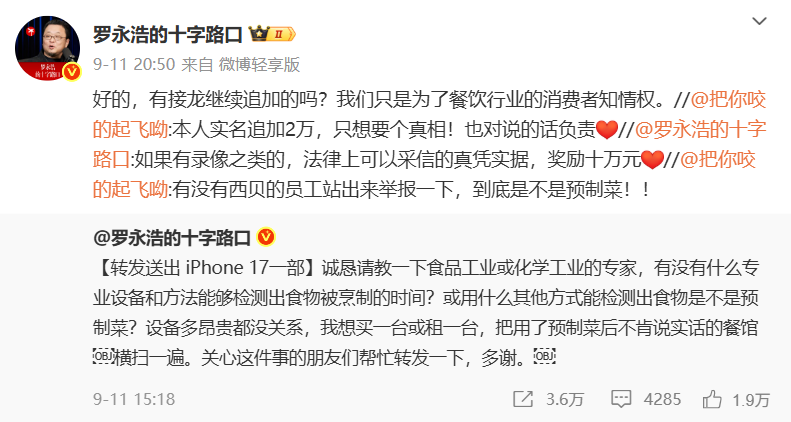 不光嘴说,罗永浩还搞了个 “大招”:发了个十万块的悬赏,公开找西贝用预制菜的 “实锤”,呼吁西贝的员工,要是知道内幕,就私信联系他。