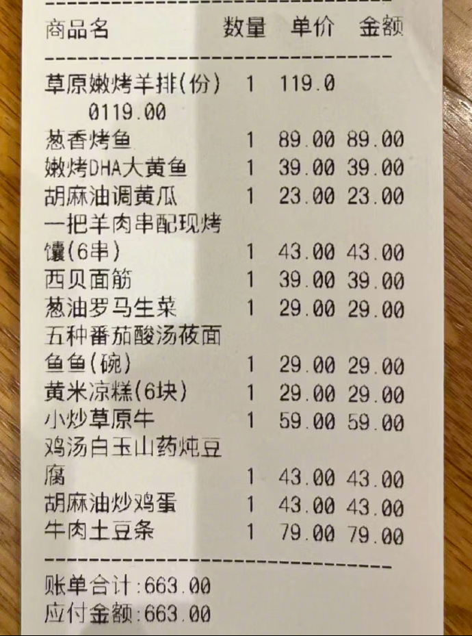 针对 “当面说挺好” 这事儿,他解释:“走的时候服务员问我们怎么样,我不想难为服务人员,所以就说了句“挺好的”,这也好意思拿来说事?!” 他还详细说了当天吃的菜:羊排有隔夜重烤的味儿,葱香烤鱼里的葱带着腥味,也像隔夜的。莜面汤百分百是隔夜的味道。牛肉土豆条感觉也是隔夜的炖菜。