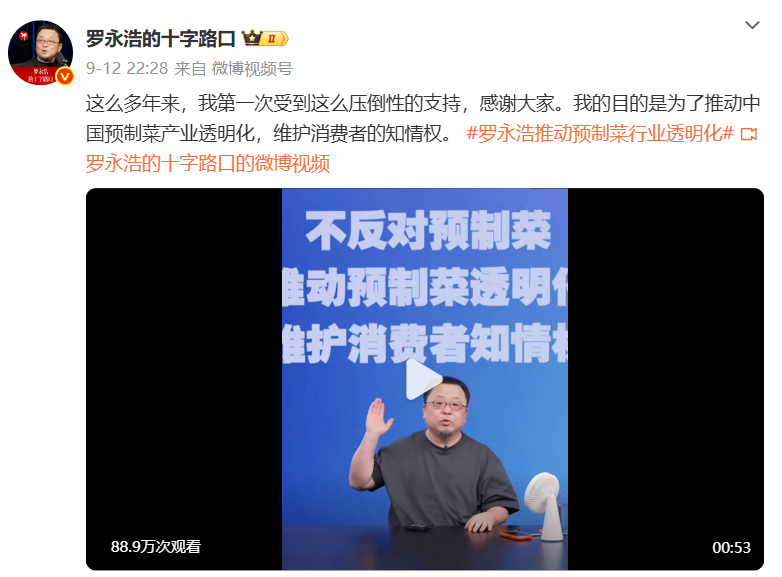 9月12日晚上,罗永浩干脆开了场直播,在抖音、微博、B 站同步播,称不反对预制菜,希望借此事件推动中国预制菜行业透明化,保障消费者的知情权。近一小时的直播仅抖音单平台观看人次就超百万。