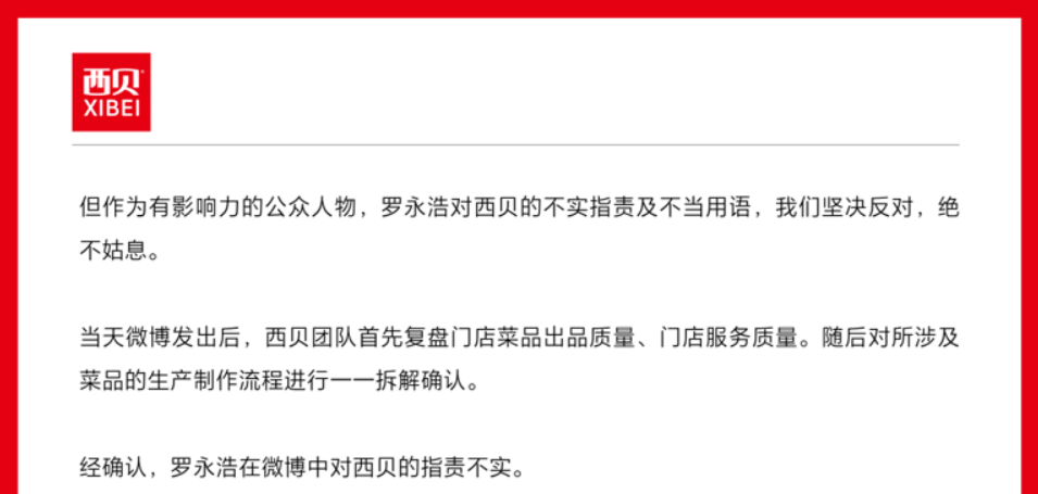 9 月 12 号下午,西贝先发了封公开信,态度还是很强硬:“罗永浩这么指责我们,还用‘恶心’这种词,我们坚决不接受,也不会姑息。”
