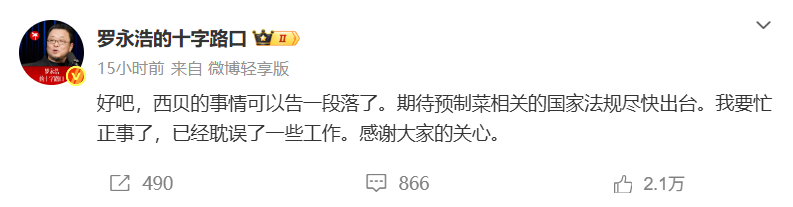 9月13日这天,罗永浩发了近 30 条微博,继续说西贝的事儿,但最后一条微博里,他松了口:“西贝的事情可以告一段落了。期待预制菜相关的国家法规尽快出台。”