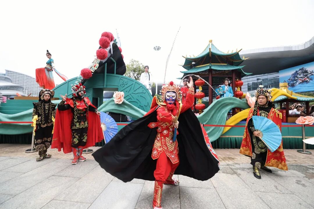 场馆外,38组特色文旅IP表演团队轮番献艺,广东潮汕金浦英歌舞、西藏山南藏戏、福建“簪花围”、陕西“宝鸡社火”、河南浚县社火高跷、四川变脸等众多宝藏级文旅IP荟萃一堂,为观众带来一场一站式、沉浸式的全国文化风情大赏。