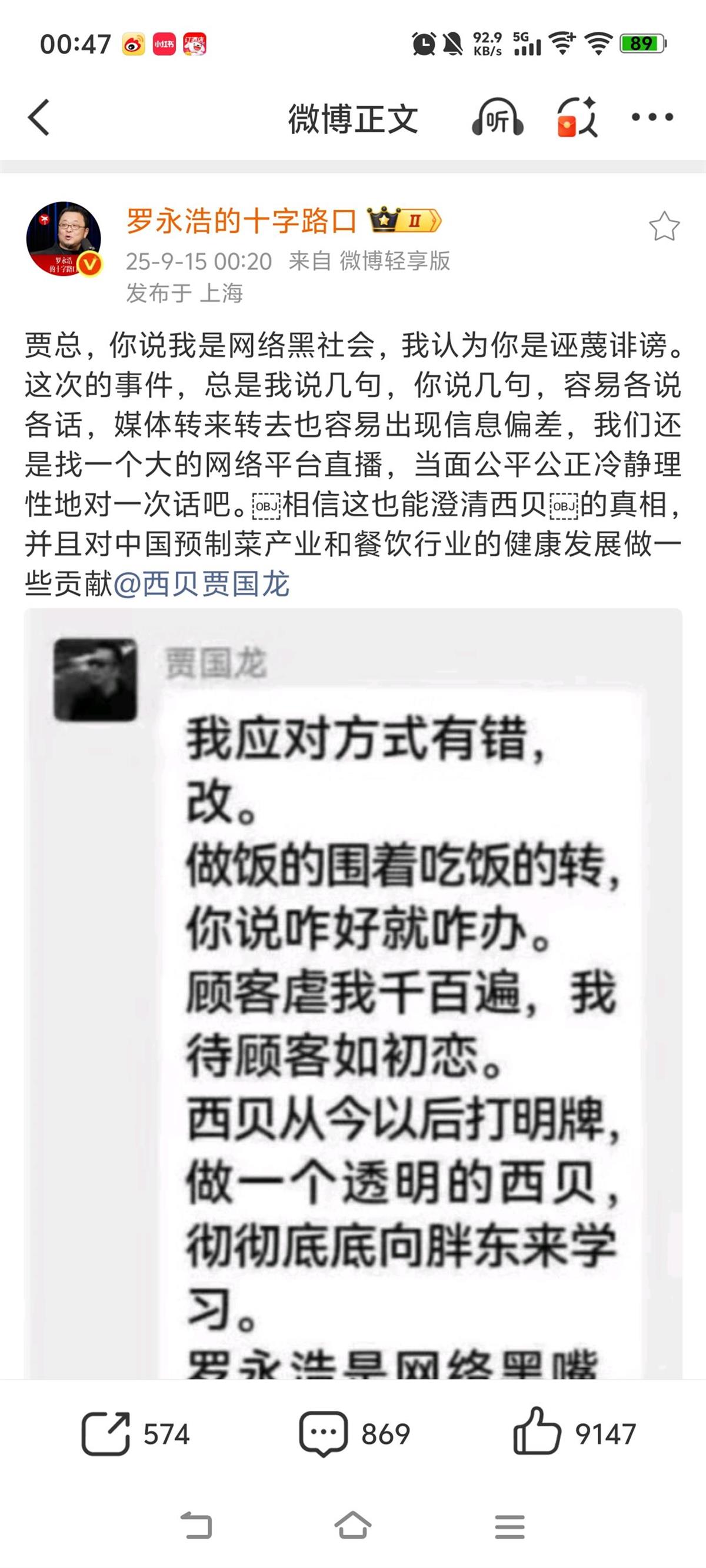 针对这张截图,罗永浩再次发微博回应称“没法揭过去了”,并喊话贾国龙当面对话直播。营销品牌公司华与华创始人华杉因在社交平台中发文力挺西贝,也受到罗永浩的吐槽。