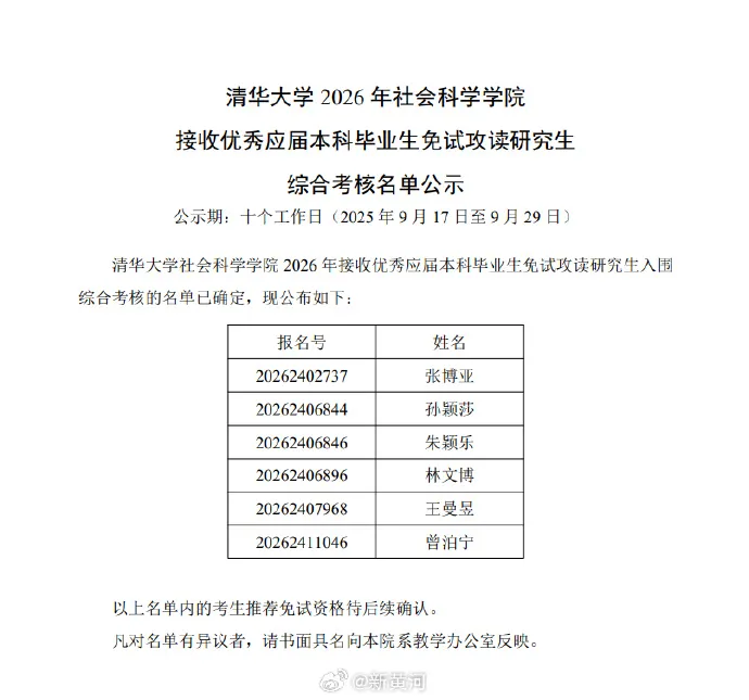 9月16日,清华大学社会科学学院对清华大学2026年社会科学学院接收优秀应届本科毕业生免试攻读研究生综合考核名单进行公示,中国乒乓球队运动员孙颖莎、王曼昱榜上有名。