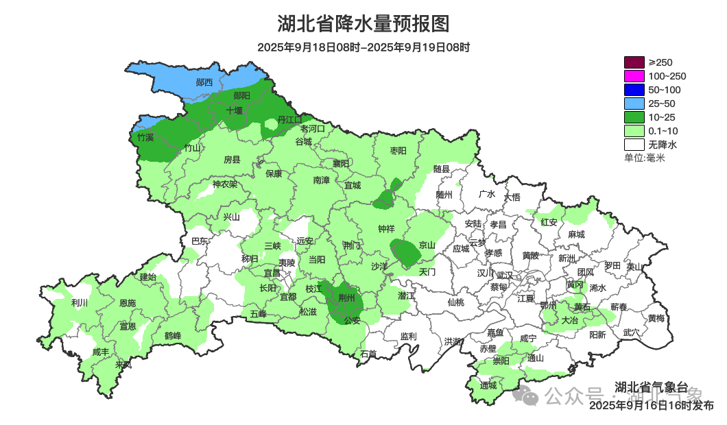 9月18日08时-19日08时,鄂西北西部阴天有小到中雨,局地大雨;其他地区阴天到多云,有分散性阵雨或雷阵雨。最高气温中西部18~23℃、东部25~29℃,最低气温鄂西北14~18℃、其他地区19~22℃,偏北风3到4级、阵风5到6级。