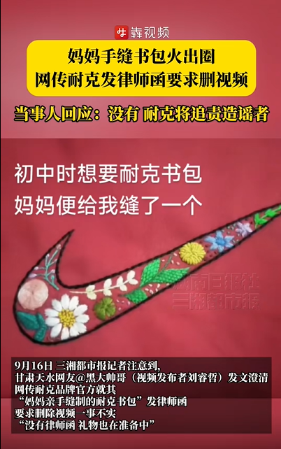 9月16日,三湘都市报记者注意到,甘肃天水网友@黑大帅哥(视频发布者刘睿哲)发文澄清,网传耐克品牌官方就其“妈妈亲手缝制的耐克书包”发律师函要求删除视频一事不实,“没有律师函,礼物也在准备中”。16日中午,刘睿哲回应了三湘都市报记者,“假的,耐克官方将追责这个造谣者。 ”此前,他因晒出妈妈多年前为自己缝制的耐克书包视频火遍全网,引发广泛关注。