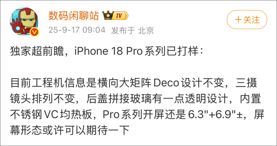 据新浪科技,博主@数码闲聊站今天在微博透露了苹果iPhone18Pro系列手机的超前瞻消息。博主表示,iPhone18Pro系列手机已经开始打样,目前工程机在大体设计上保持不变,维持横向大矩阵后置镜头模组,三摄镜头排列也与17Pro系列一样,后盖拼接玻璃有一点透明设计,内置不锈钢VC均热板,Pro系列开屏还是6.3"、6.9"左右,屏幕形态“或许可以期待一下”。