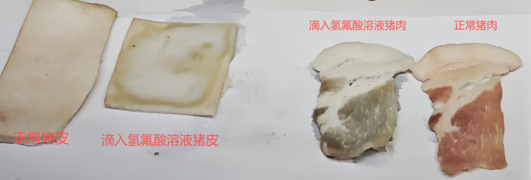 实验室的通风厨上并排放着两组新鲜猪肉和猪皮,王超洋副主任用滴管取少量40%浓度的氢氟酸溶液,分别滴落在猪皮和猪肉表面。不到一分钟时间,原本粉白色的猪皮表面迅速浮现出一片油脂状的乳白色痕迹,十几秒后,粉红色的猪肉也变为灰白色。