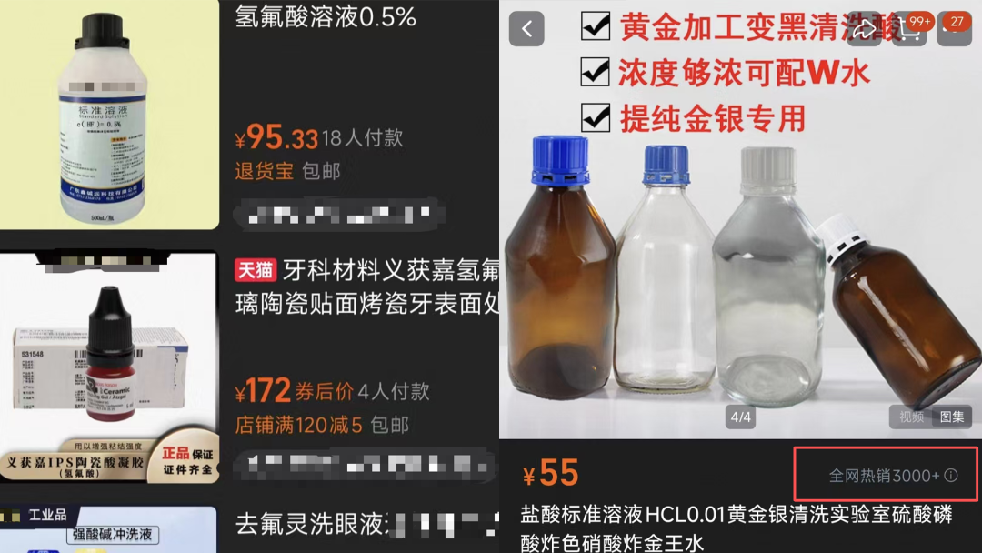令人担忧的是,记者在某些电商平台以“氢氟酸”、“硫酸硝酸”、“HF溶液”等关键词进行检索,可以轻易购得此类高危化学品。