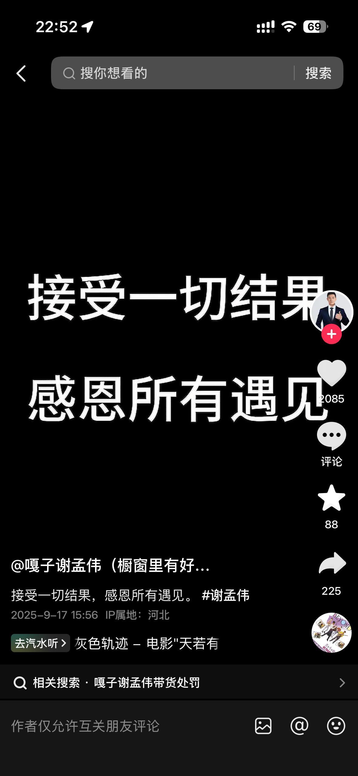 记者查询谢孟伟的个人抖音号看到,17日15时56分,他发视频称,接受一切结果,感恩所有遇见。