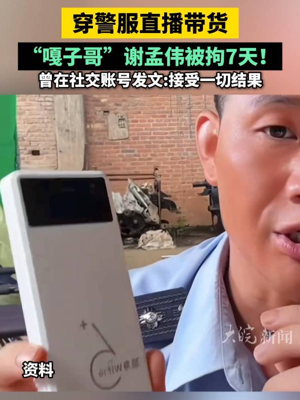 9月10日,“嘎子谢孟伟”身穿警察制式服装直播带货,被网友举报。9月17日晚,耿马县公安局发布警情通报称,依法对谢某某(即谢孟伟)行政拘留7日。