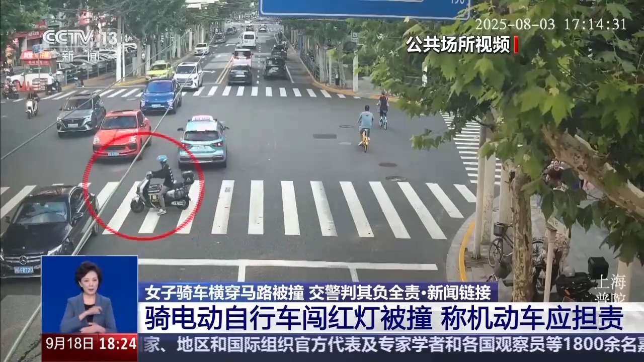 在上海静安区共和新路延长路路口,一辆电动自行车闯红灯穿越了多条车道后,突然出现在了直行车道上,结果白色轿车刹车不及撞了上去。事故最后认定电动车骑车人负事故全部责任,并承担机动车修车费用。