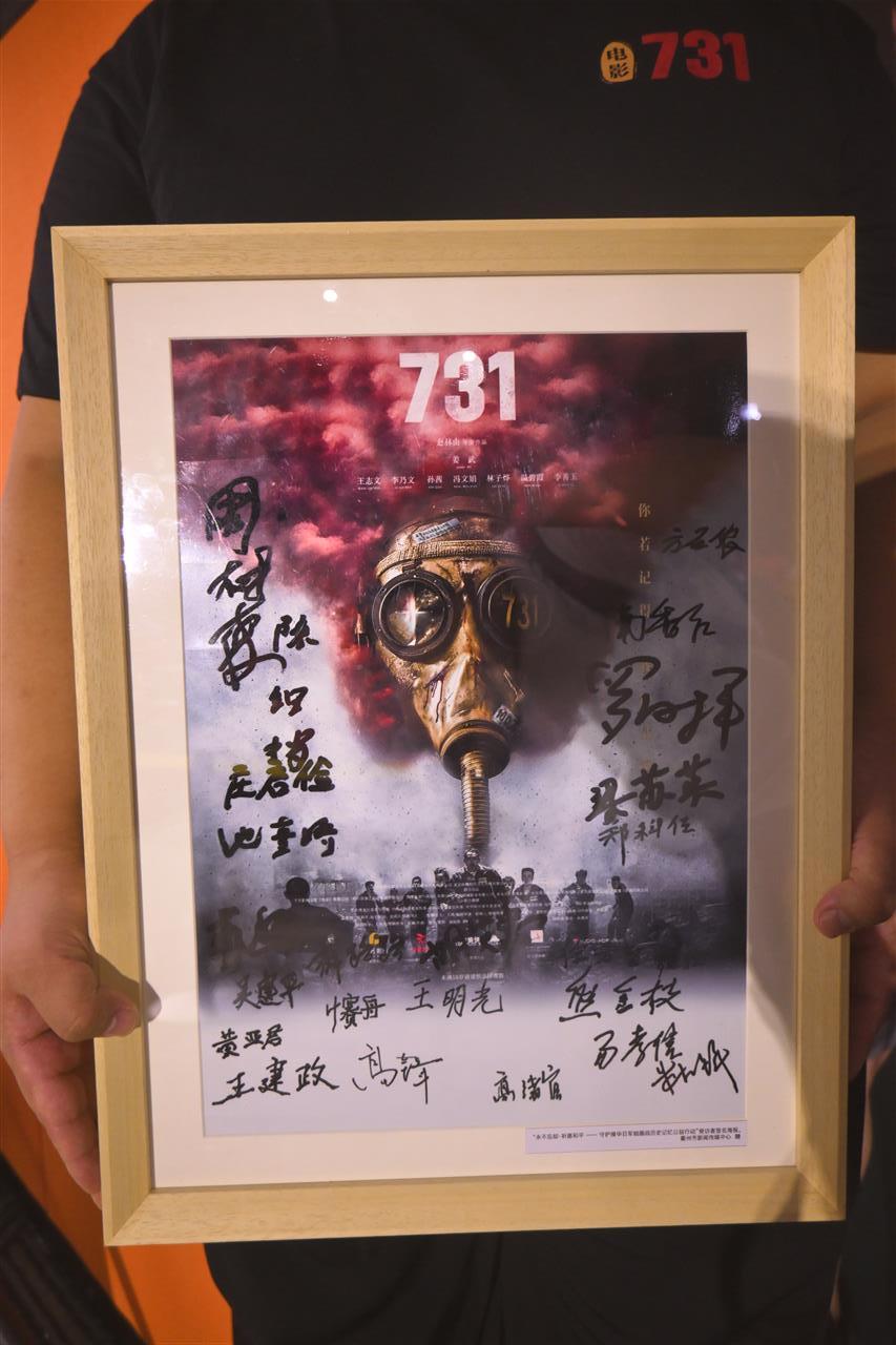 20日下午3时许,在博纳院线影城衢州银泰城店《731》特殊场放映结束后,电影主创团队与观众进行了交流。极目新闻记者看到,一张写有多名细菌战受害者及其遗属的签名海报被送到了导演赵林山手中,赠送者分享了收集签名的过程。赵林山动情地说,《731》不仅是一部电影,更是移动的“731”罪证馆。