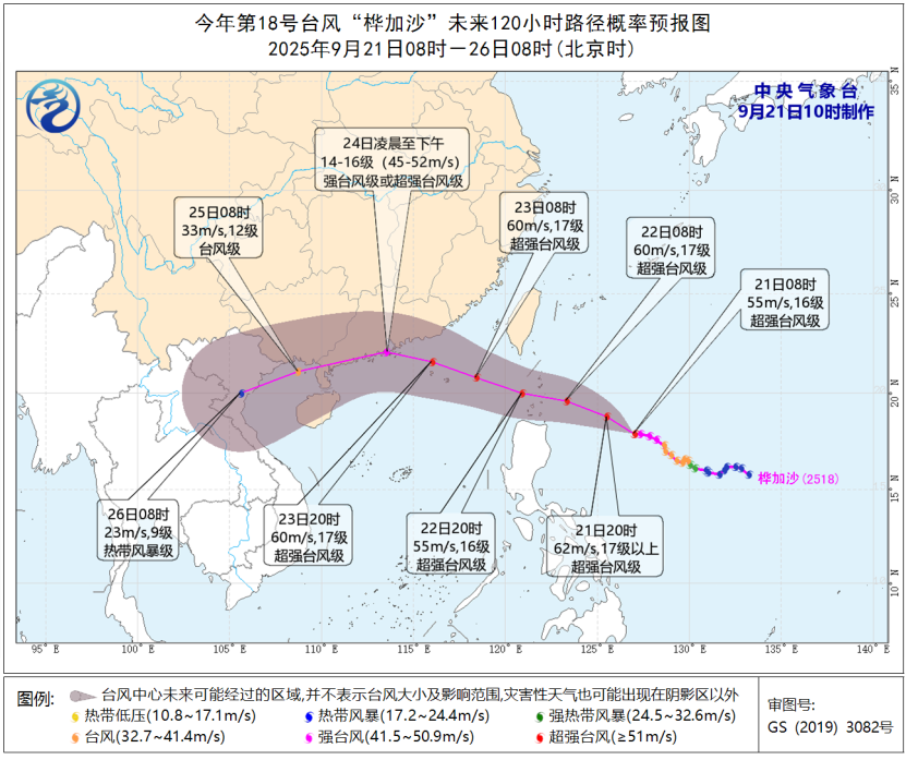 中央气象台预计,23日开始,台风“桦加沙”23日将进入南海东北部海面,后期强降水将陆续影响广东、福建、广西等地,最强影响时段为23日至25日,台湾海峡南部、南海北部海域、华南沿海都将出现强风雨天气。