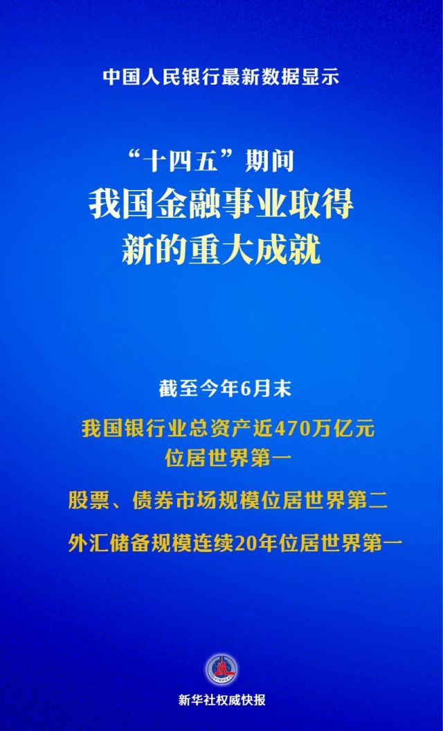 截至今年6月末,我国银行业总资产近470万亿元,位居世界第一;股票、债券市场规模位居世界第二;外汇储备规模连续20年位居世界第一。
