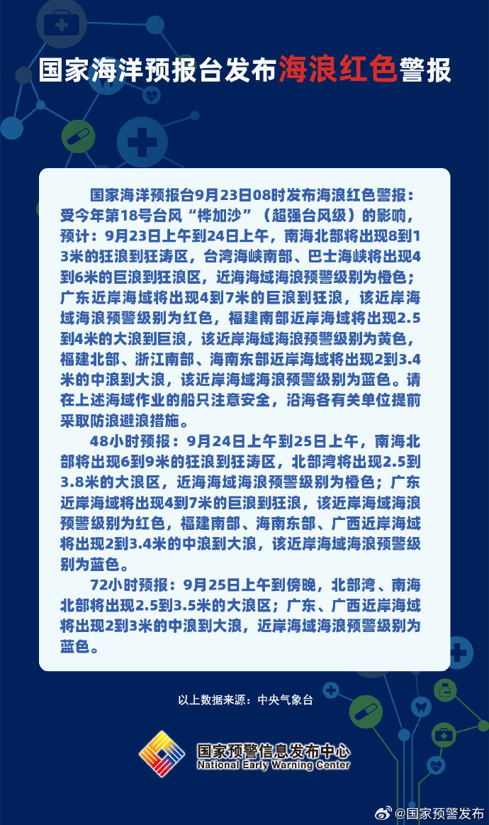 国家海洋预报台9月23日08时发布海浪红色警报:受今年第18号台风“桦加沙”(超强台风级)的影响,预计:9月23日上午到24日上午,南海北部将出现8到13米的狂浪到狂涛区,台湾海峡南部、巴士海峡将出现4到6米的巨浪到狂浪区,近海海域海浪预警级别为橙色;广东近岸海域将出现4到7米的巨浪到狂浪,该近岸海域海浪预警级别为红色,福建南部近岸海域将出现2.5到4米的大浪到巨浪,该近岸海域海浪预警级别为黄色,福建北部、浙江南部、海南东部近岸海域将出现2到3.4米的中浪到大浪,该近岸海域海浪预警级别为蓝色。