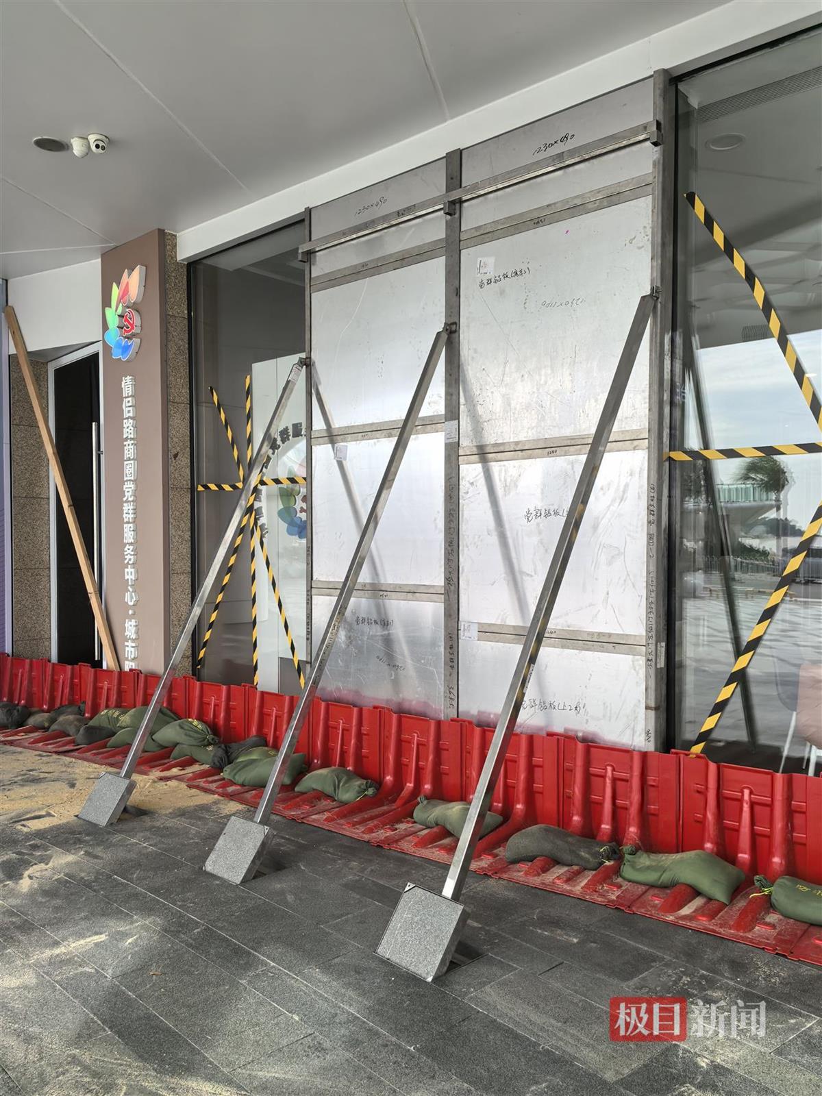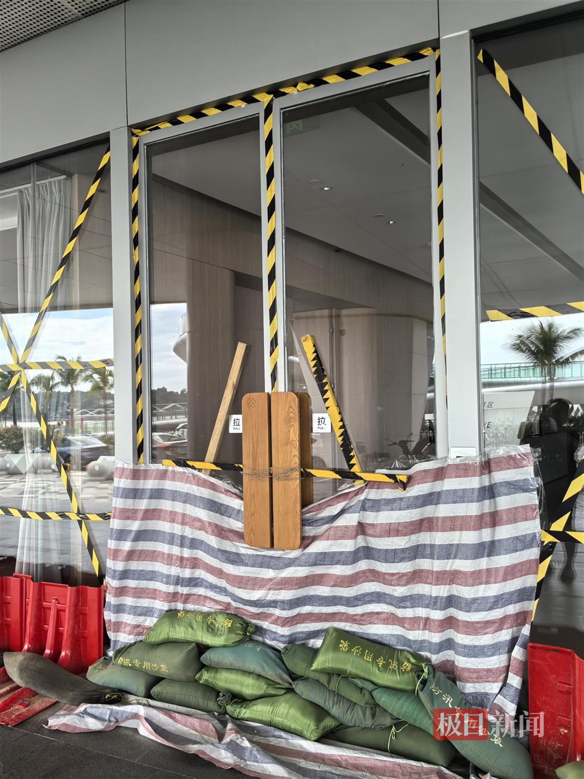 珠海著名的网红打卡地城市阳台,这里紧临大海,工作人员正在忙着给商铺玻璃门和窗户贴胶带,放置挡水板,堆放沙袋。这里的商业负责人告诉极目新闻记者,从9月22日起就开始应对,一共采取了贴胶带、铝板加固、放置挡水板、堆放沙袋4项措施,以应对此次超强台风。