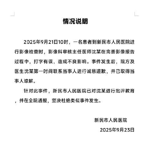 辽宁新民市人民医院通报:2025年9月21日10时,一名患者到新民市人民医院进行影像检查时,影像科审核主任医师沈某在完善影像报告过程中,打字有误,造成不良影响。事件发生后,院方及医生沈某第一时间联系当事人进行诚恳道歉,并已取得当事人谅解。