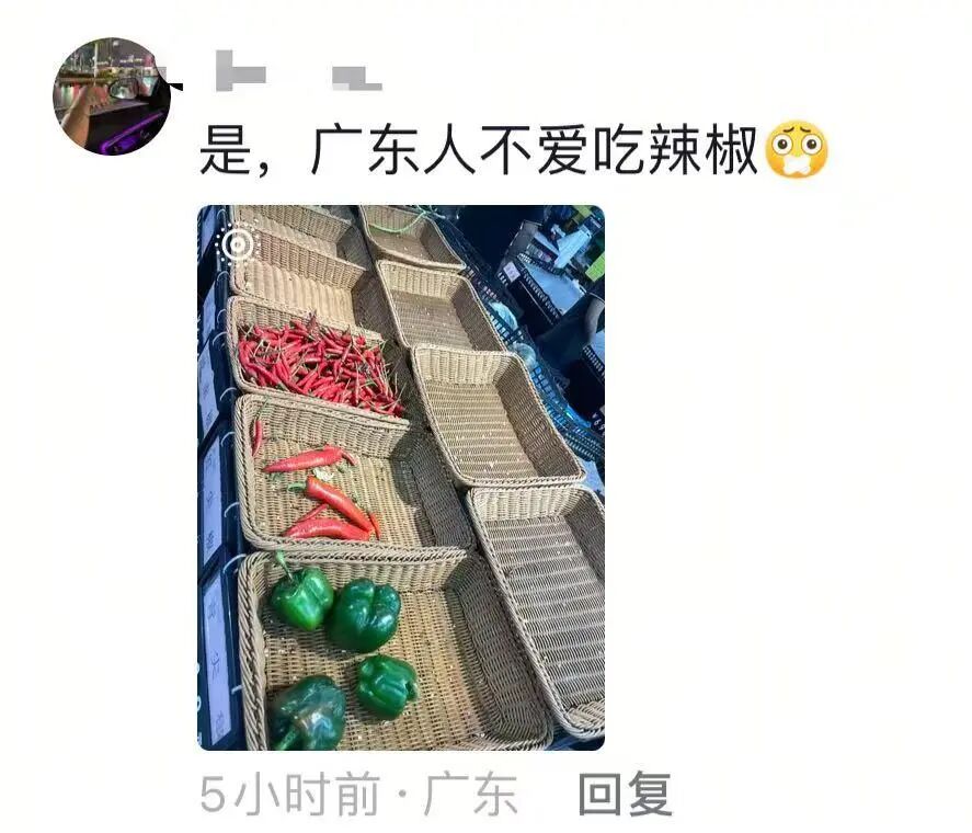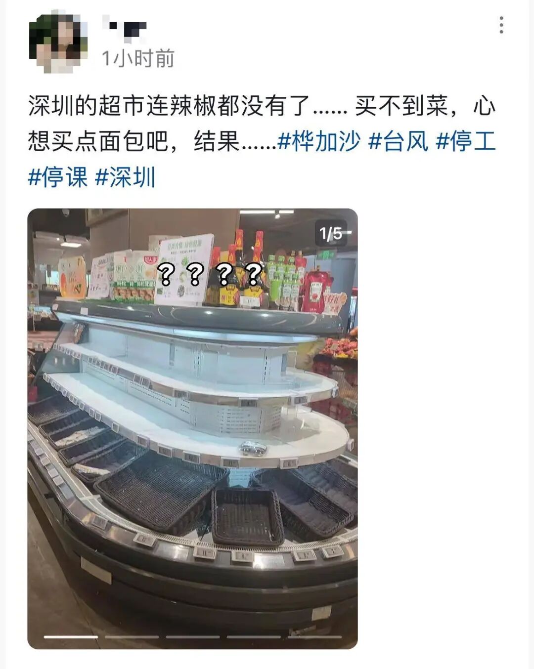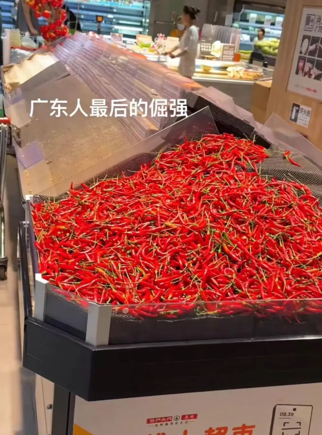 9月22日,许多广东网友发视频称超市蔬菜和肉都被抢购一空,就剩下辣椒,表示不吃辣椒是广东人最后的倔强。货架上还有火鸡面等有辣味的方便面。