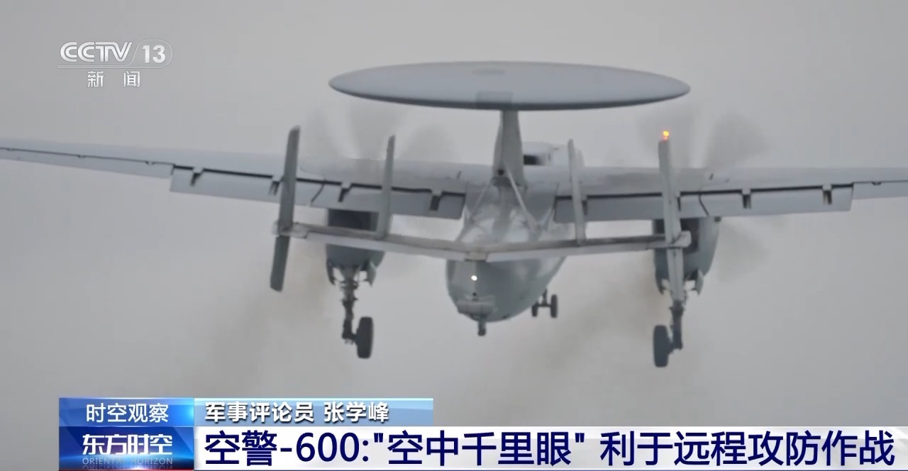 空警-600是一种舰载固定翼预警机,具有续航时间长,作战半径远的特点。它搭载的雷达可以实现360度无死角的探测,可以在数百公里外看清对方的空中目标,指挥引导己方的战机进行拦截。