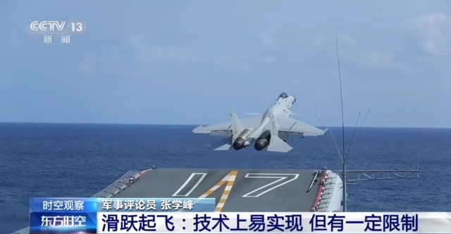 军事评论员张学峰介绍,现役航母中主要采取两种起飞方式,一种方式是采用滑跃甲板,如辽宁舰、山东舰。