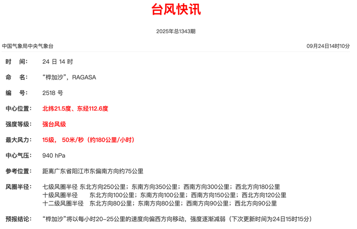 中央气象台最新消息,9月24日14时,“桦加沙”减弱为强台风级,中心附近最大风力为15级,50米/秒(约180公里/小时),中心位于距离广东省阳江市东偏南方向约75公里的海面上。预计“桦加沙”将以每小时20-25公里的速度向偏西方向移动,强度逐渐减弱。