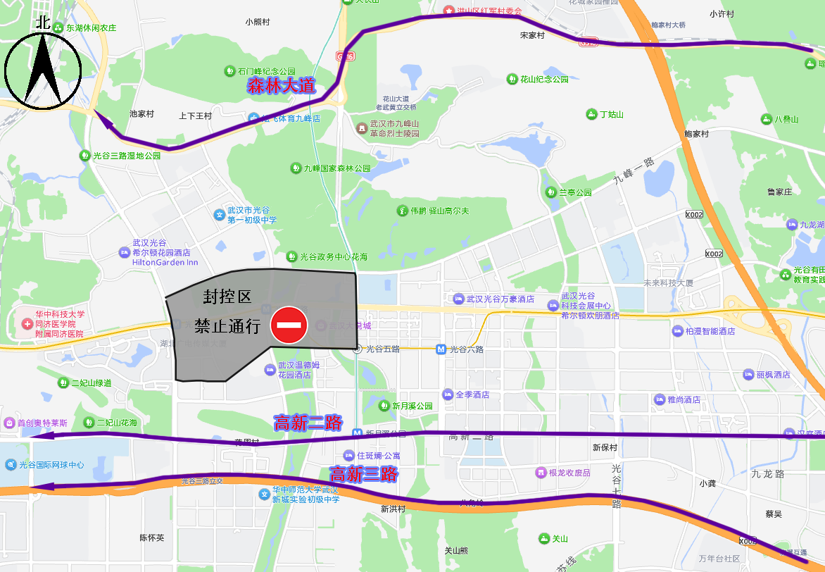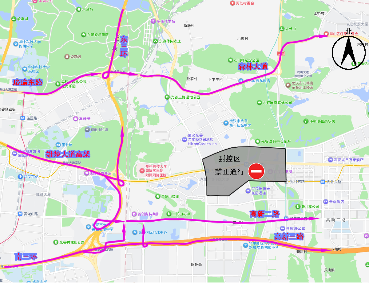 东湖高新区东向西车辆建议从森林大道、高新二路、高新三路绕行。